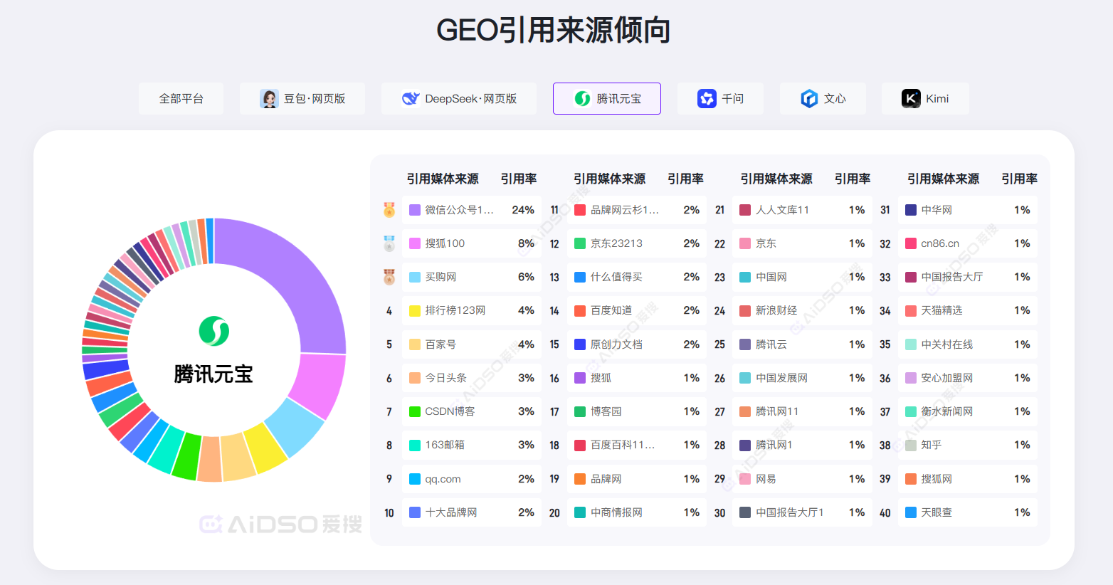 国内大模型(如腾讯元宝)在生成答案时,会深度抓取微信公众号(占比高达24%)、今日头条、小红书、知乎等平台的内容。