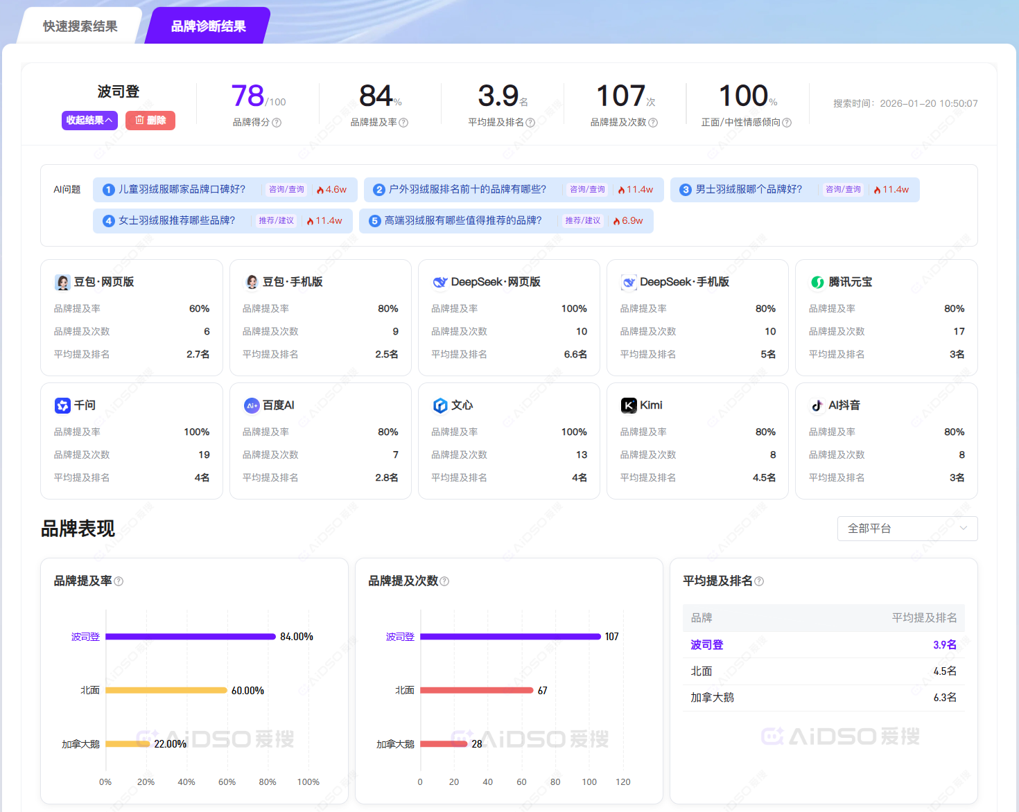 - 资产盘点与诊断:使用AIDSO爱搜的“品牌诊断”功能,检测品牌在豆包、DeepSeek 等平台的真实现状