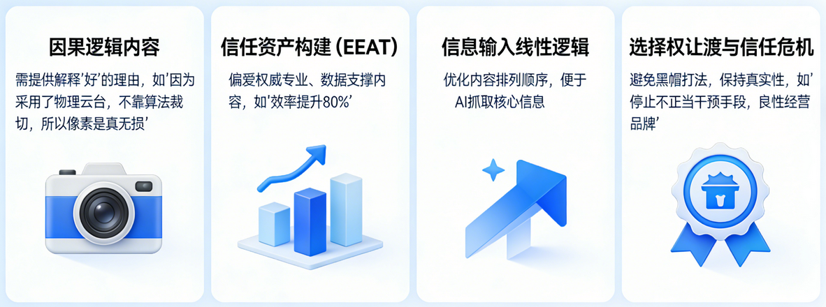 - 它喜欢有因果逻辑的内容 :你说“我家相机画质好”,AI没感觉;但如果你说“因为采用了物理云台,不靠算法裁切,所以像素是真无损”,它就能听懂逻辑并转述给用户。你要给AI一个解释你“好”的理由