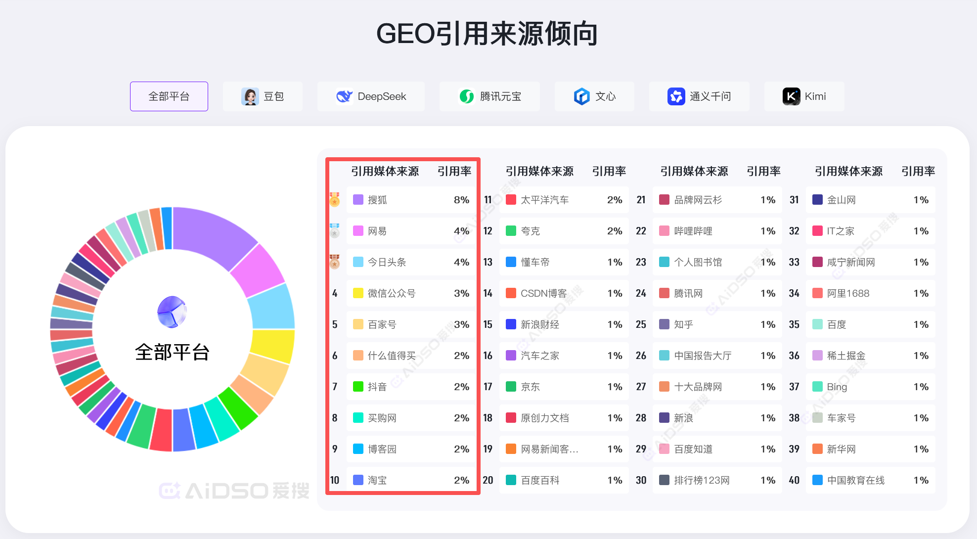 爱搜AIDSO对300+品牌的引用来源分析显示,根据爱搜平台监测数据,不同 AI 平台引用偏好不同: