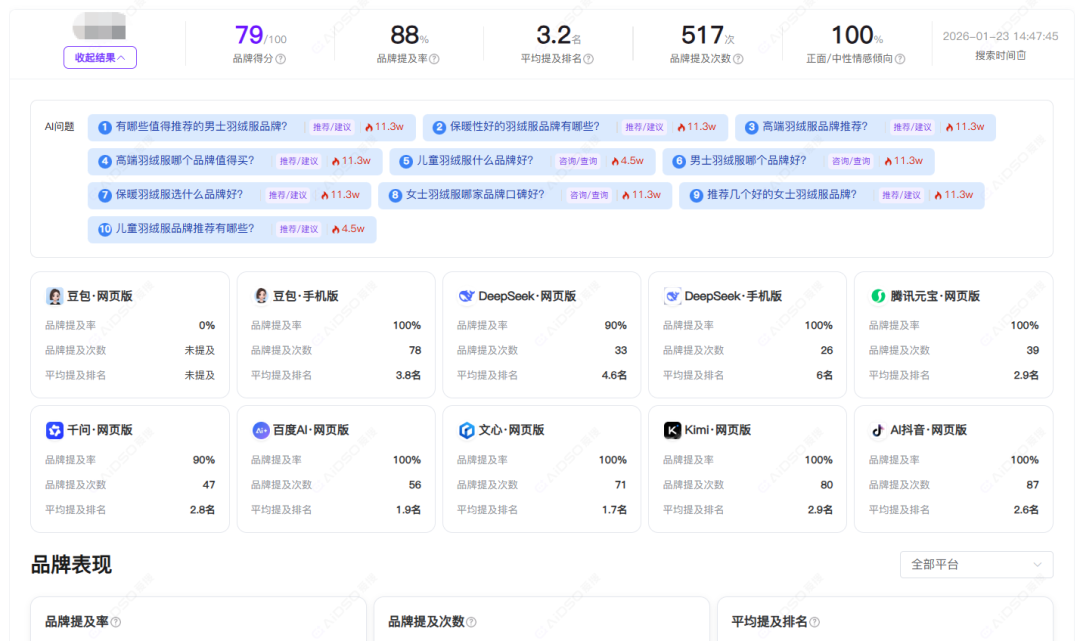 品牌得分:直观判断品牌在AI搜索中的整体竞争力。