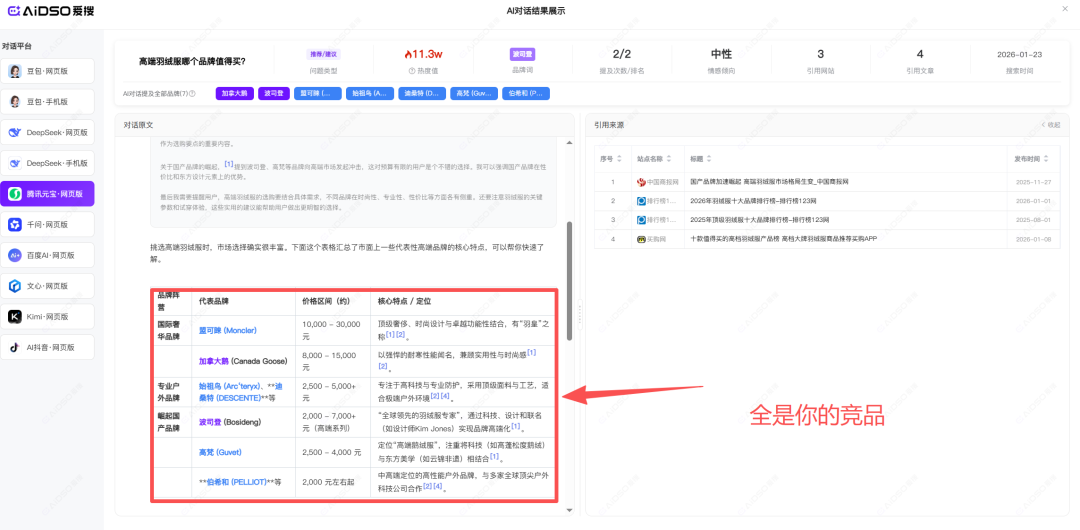 通过AIDSO爱搜的“品牌诊断”功能,你能一眼就能看穿竞品的“截流”路径!