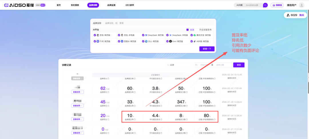 进场前:数据揭短,引导签单。客户总觉得自己品牌做得不错。你直接用AIDSO爱搜跑一份诊断。提及率低、排名靠后、引用源全是杂牌网站。数据摆在桌上,客户不签单都难受。