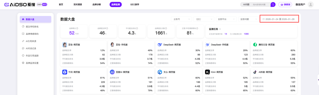 捕捉“流量震荡”:AI的算法是时刻在变的。你的提及率今天涨了10%,明天可能就跌了。通过AIDSO爱搜的实时大盘(支持按日期筛选),你能第一时间发现波动,并通过分析是不是竞品发了猛料。