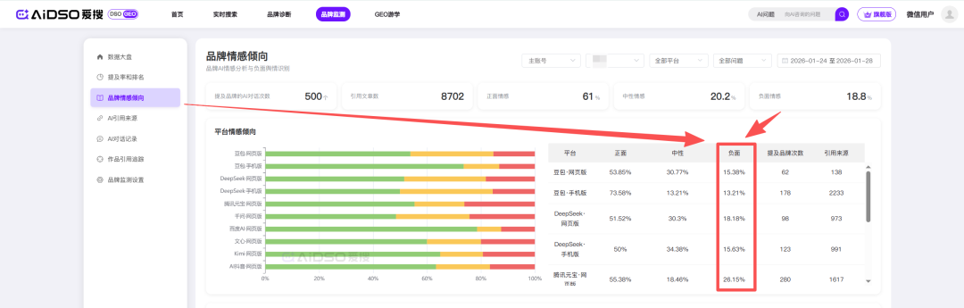 现象:点开AIDSO爱搜的“情感倾向”分析,发现柱状图里全是“负面”或“中性”。原因:网上全是投诉,或者全是毫无感情的通稿。AI如实反映了全网对你的评价。