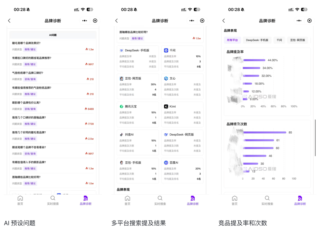 AIDSO爱搜:GEO数据分析工具,核心功能:快速搜索+品牌诊断+品牌监测。已实现对阿里通义千问、月之暗面Kimi、腾讯元宝、字节豆包、百度文心一言、深度求索DeepSeek及其多终端与“AI抖音”在内的十大主流AI平台的全景覆盖。欢迎体验:geo.aidso.com,添加小助理演示工具以及参与线下活动,同时加群和领取各种福利: