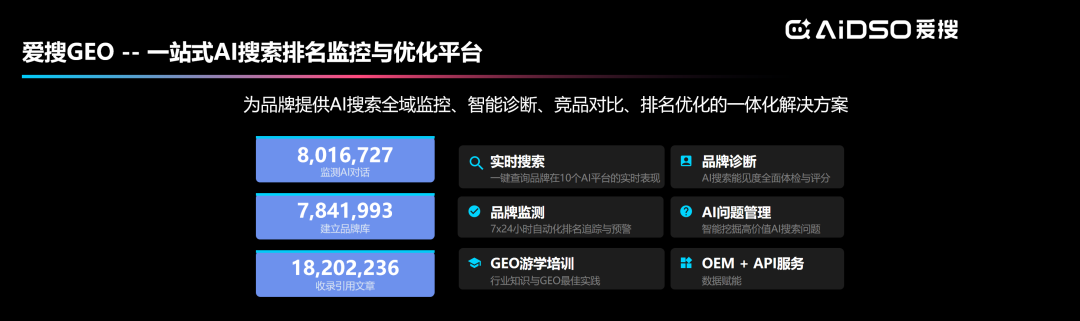在 GEO 行业竞争日趋白热化的当下,核心竞争力已从“表面发文”转向“深层数据”,尤其是KA客户,发文仅为服务闭环的最后一个环节,而数据需求贯穿 GEO 服务全链路,成为决定服务质量、抢占市场先机的关键所在。AIDSO爱搜,以硬核技术与全维度数据优势,打造可 OEM 定制的核心解决方案,助力合作伙伴快速搭建自有品牌,轻松领跑行业。