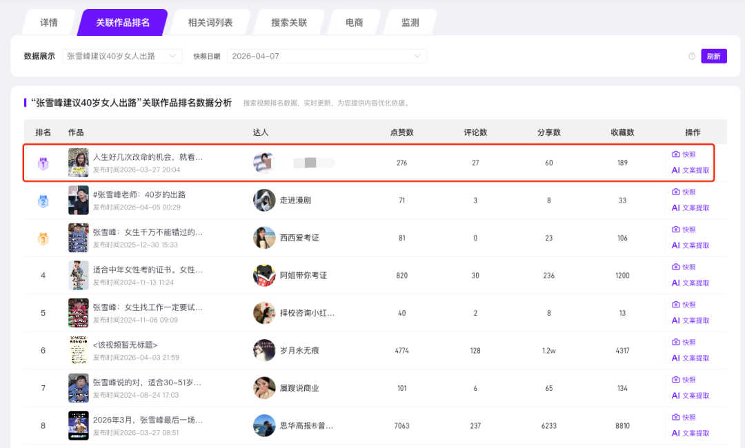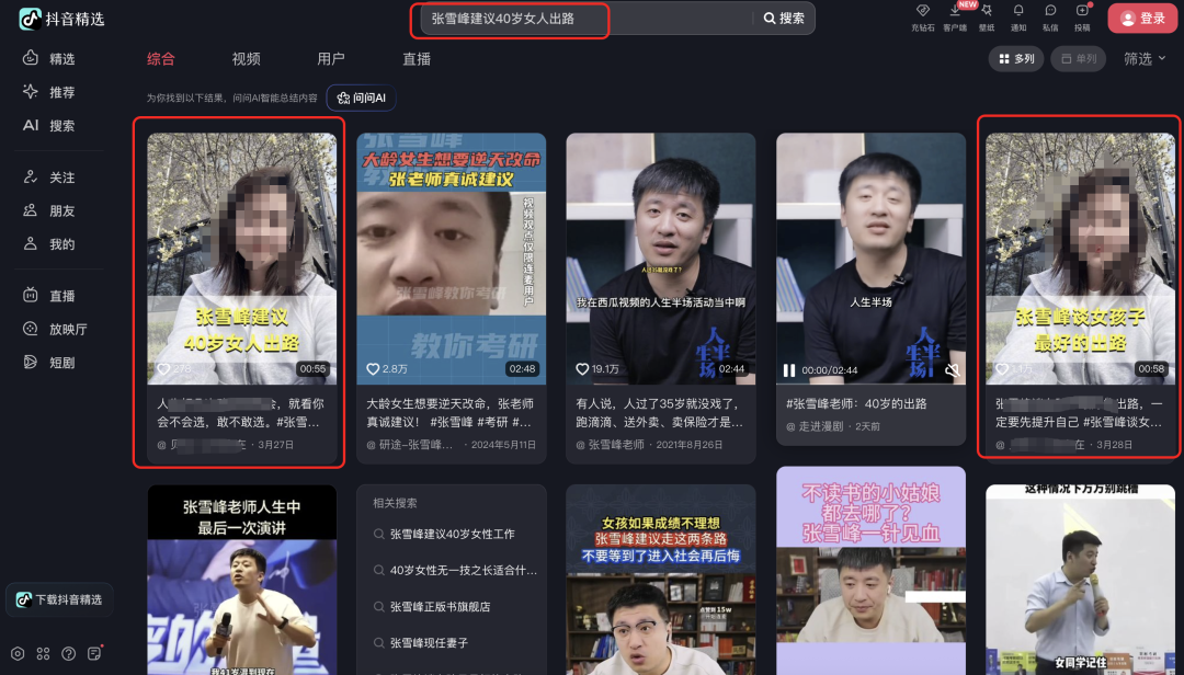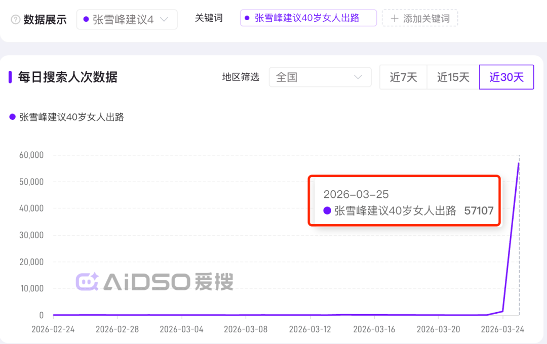 核心操作:张雪峰老师逝世热点第二天,她没有盲目跟风蹭热点,而是打开爱搜,精准捕捉到一个搜索量暴涨的关键词——“张雪峰建议40岁女人出路”。