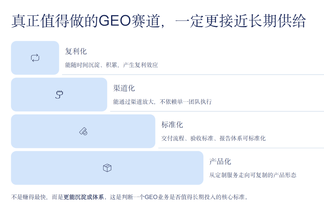 - GEO是:帮模型省 Token、提升品牌 AI 曝光概率、建立可信 AI 事实与分发资产