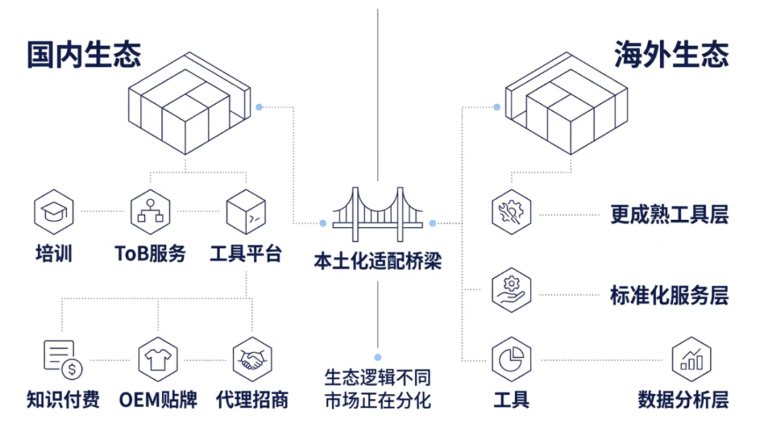 当前国内 GEO 市场处于早期混战阶段,已衍生出培训、ToB 全案、ToC 小单、工具平台、OEM 贴牌、代理招商等 7-8 种业态,海外生态成熟度领先国内约半年,但底层逻辑不同,不可直接照搬。