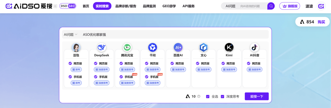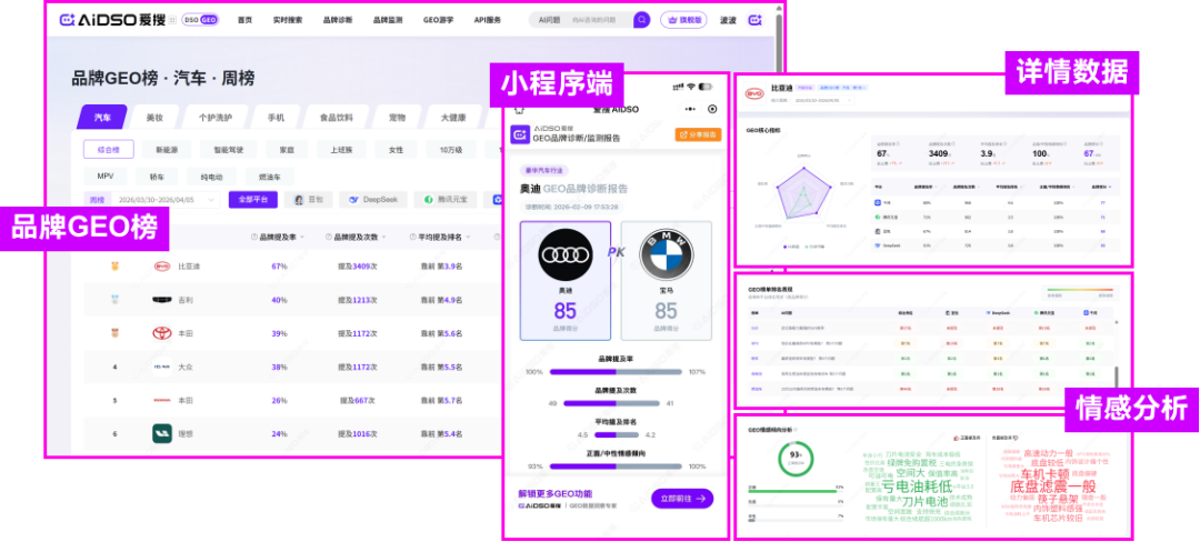 AIDSO爱搜:GEO数据分析工具,核心功能:快速搜索+品牌诊断+品牌监测。已实现对阿里通义千问、月之暗面Kimi、腾讯元宝、字节豆包、百度文心一言、深度求索DeepSeek及其多终端与“AI抖音”在内的十大主流AI平台的全景覆盖。欢迎体验:geo.aidso.com,添加小助理演示工具以及参与线下活动,同时加群和领取各种福利: