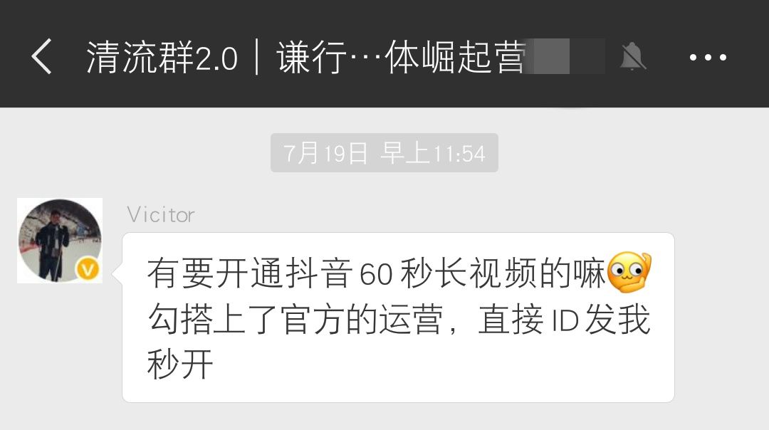 比如你在群里说:最近勾搭上了抖音的运营,可以无门槛开60S视频权限,需要的私聊我,仅限本群伙伴噢~这样的引流效果你想想能不好吗?