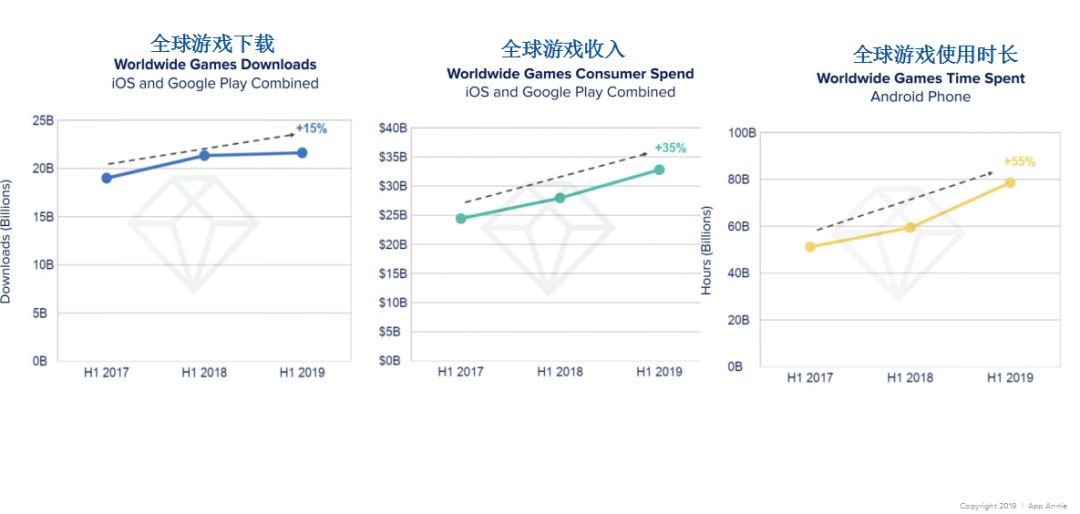再看一下游戏收入。收入整体状况是逐年都在增加,全球市场2017上半年 - 2019年上半年有35%的增长。特别提醒大家注意,尤其是做超休闲、休闲游戏的开发者,虽然下载量接近持平了,但收入仍在持续增长。