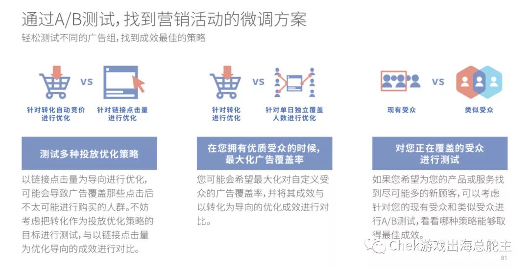 二、A/B测试(A/B Test),让您能够把目标受众细分到不同组别,通过比较受众、版位、投放优化及创意素材等不同因素,简单有效地衡量单次操作费用、链接点击率等指标之间的差别,根据不同广告组的测试结果,找到最为高效的广告,从而对营销策略进行调整。
