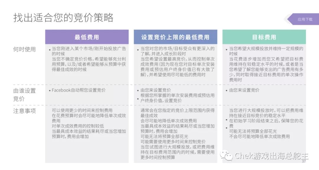 - 目标费用竞价 (Target cost):适合有严格谨慎的CPI /LTV优化模式,比如希望大规模投放,同时把费用维持在接近目标竞价的水平时使用。