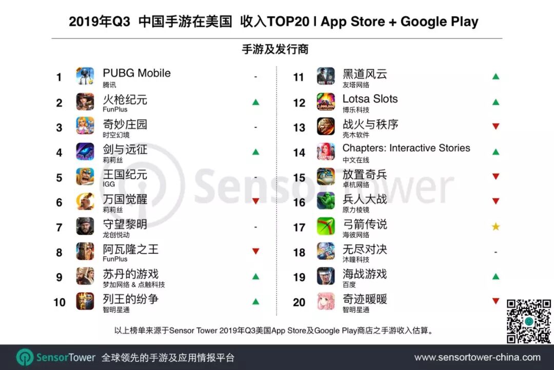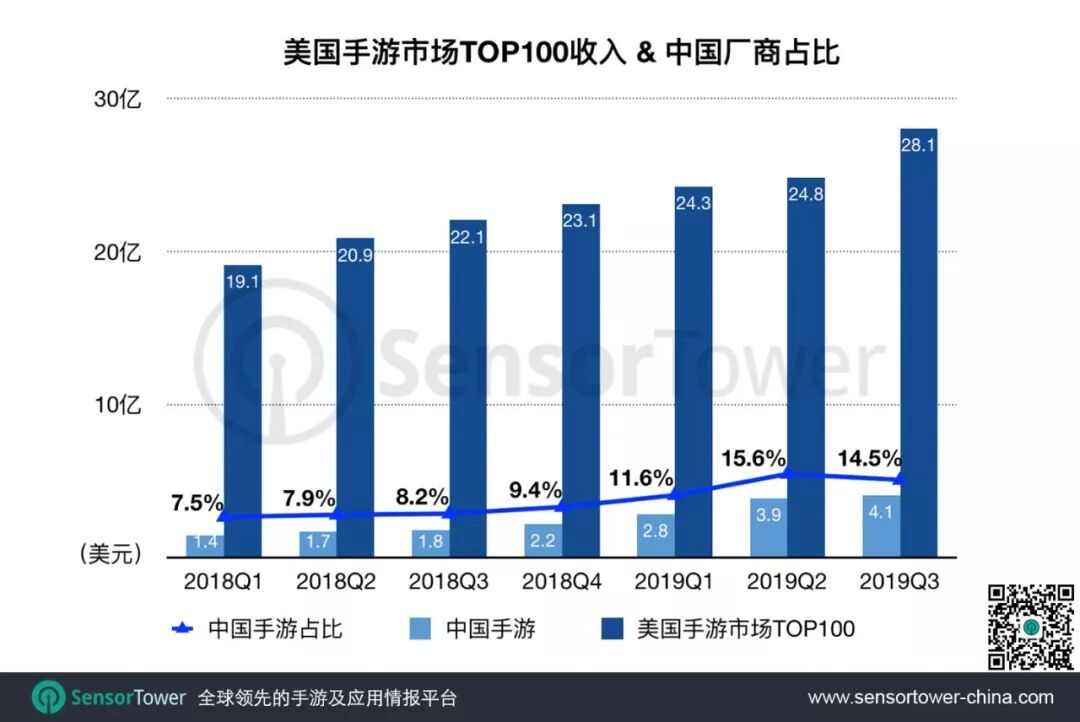 Sensor Tower 商店情报数据显示,美国作为全球 App Store 和 Google Play 总收入最高的手游市场,2019年Q3收入进一步增长,达到41.6亿美元。在美国市场收入Top100手游中,中国手游共17款,收入达4.1亿美元,占Top100总收入的14.5%,较去年Q3增长127%。详细数据如下。
