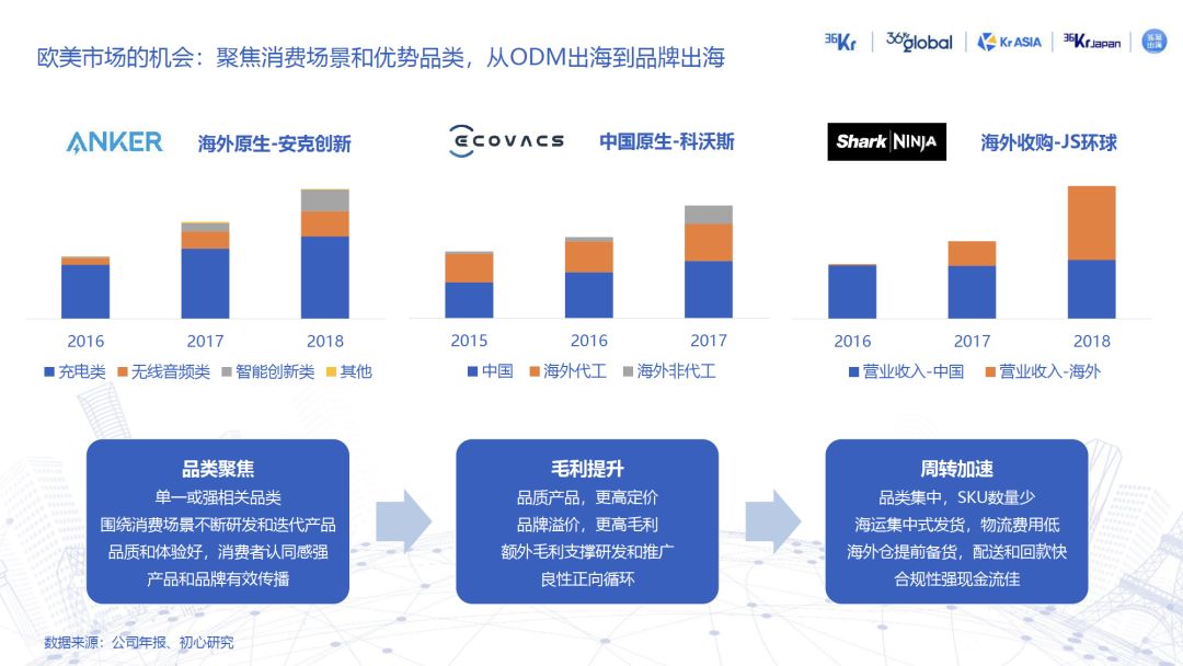 第一, 安克是中国现在跨境电商增长、利润率都是TOP级的,去年也有50多亿的人民币的销售,它是海外原生的,最早就是做美国市场。他们最早做充电宝,围绕充电宝把电源这个品类打穿,这个公司的打法深耕一个品类,把这个品类做成当地市场的NO.1,后面也会扩品类,围绕3C差异化的品牌继续的扩展,再往国内走,从线上往下走,这是他的路径。