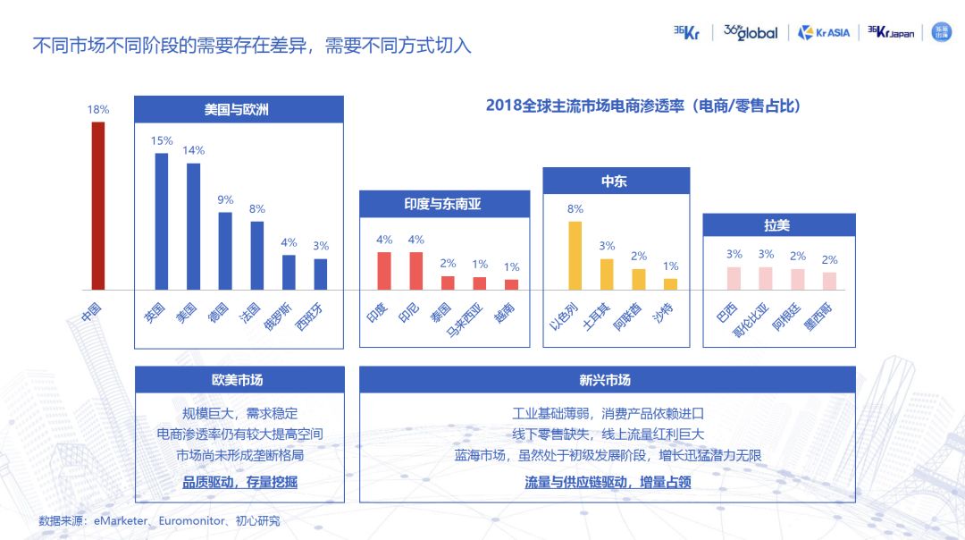 再来看需求,需求是最核心的。我们看海外,海外确实是有很大的市场需求,因为整个世界的互联网渗透率到了40%,所以对应的互联网的人群不断的增加,带来的消费在线化,让电商的发展越来越快更加速。我们且不讲跨境电商或者出海电商,只把电商放在同样的维度看,全球已经有3万亿美元的规模。同时把市场拆分开除了中国是最大的,占据了一半。有几个国家我们也要重视一下,研究一下当地的市场,包括新兴市场最核心的中东、两印地区。