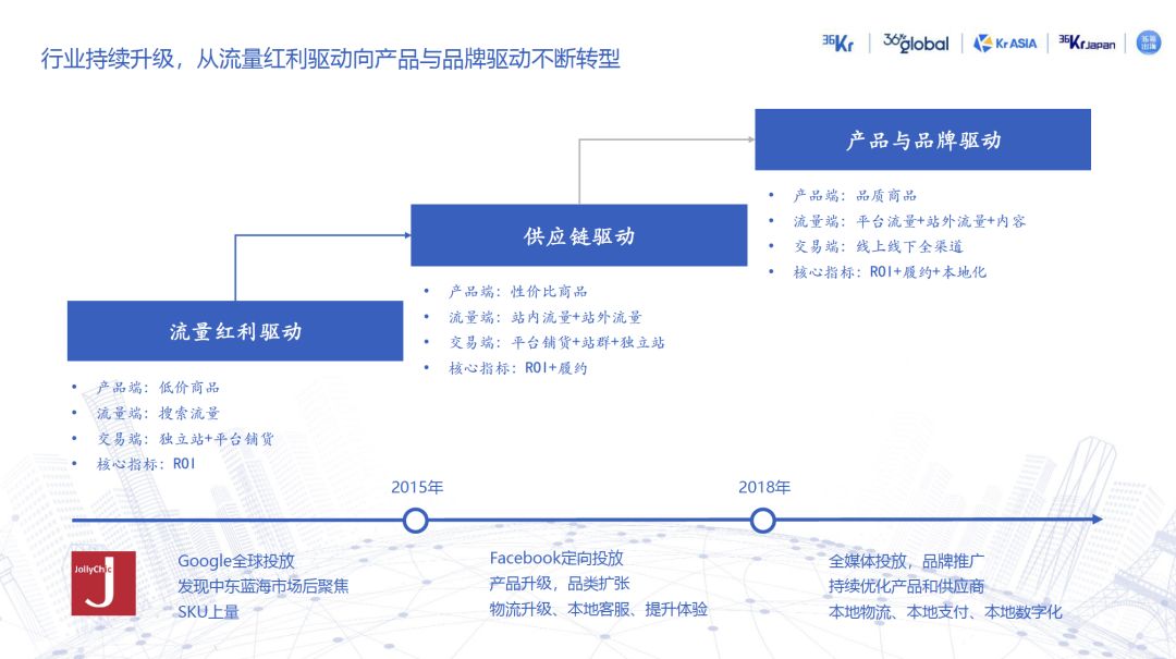 我们为什么看好整个行业?行业分为2010、2015、2018三个阶段,不同的阶段对应的发展故事和成长的路径是需要不断调整升级的。跨境电商不是新玩意儿,在中国互联网有20年,跨境电商有15年的历史在,最早熟悉的以谷歌出来做的兰亭集序做的一些流量,还有第三方平台,淘宝天猫把流量吸引过去,围绕大的平台做商家的这一波起来了。但是2015年这一波的商家日子没有那么好过,下一步围绕平台会有非常好的产品和品类聚焦的,有服务差异化的商品也有一波红利出来了。但是2018年以后又完全不一样了,我们觉得进入了拼产品和品质阶段了。