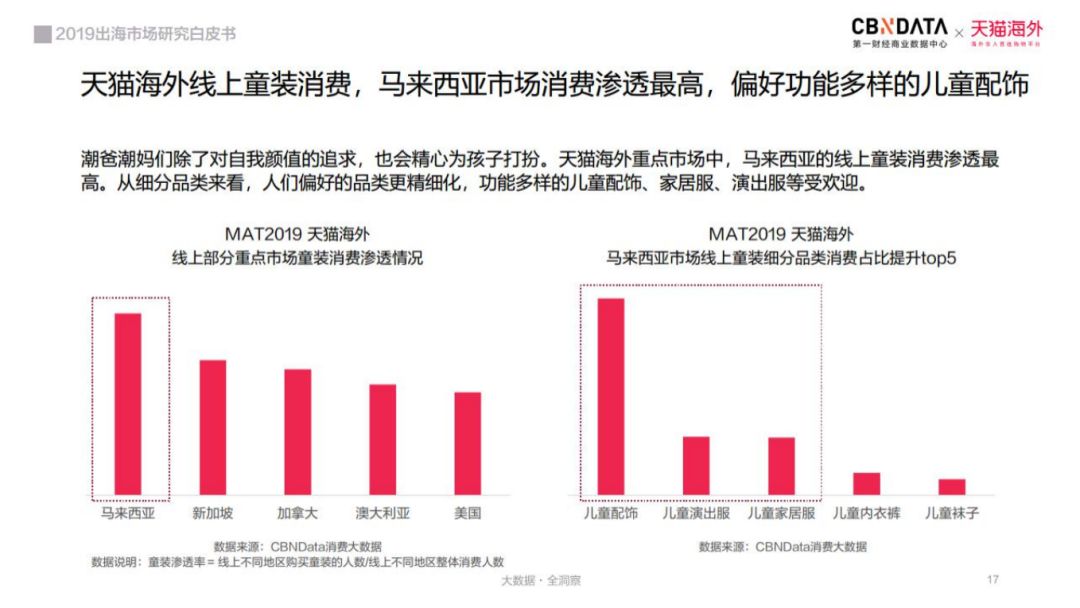 从2018年11月-2019年1月数据可见,伴随年关将至以及新春佳节的来临,中式传统家居饰品的订单量有显著的暴涨。此外,从消费人数的占比来看,近一年来,贴饰、摆件、装饰画等传统家居饰品依旧占据热门。而秉持着“独乐乐不如众乐乐”的优良美德,购买中国传统礼品赠予亲友的也大有人在。数据显示,北美、澳洲市场非常偏爱创意折扇、传统元素冰箱贴等中国风小饰品,将其作为送礼佳品赠送给亲友。穿国潮:MADE IN CHINA穿上身,国潮深入娃娃心国潮崛起,不仅成为国内消费者的新宠,更是随着在国际舞台的屡屡亮相,成功引起了海外消费者的注意。CBNData《白皮书》显示,近两年来,天猫海外线上国潮相关消费人数暴涨。分别从消费粘性和消费力水平来看,东南亚市场与北美、澳洲市场消费频次一致,但北美、澳洲市场表现出了更高的消费力水平。
