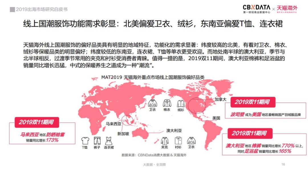 此外,从地域偏好来看,天猫海外线上国潮服饰消费的功能化需求显著。其中,纬度较高的北美,对卫衣、棉衣、绒衫等保暖品类有着明显的偏好;而在纬度较低的东南亚,连衣裙、T恤等单衣自然更受欢迎;地处南半球的澳大利亚,因季节与北半球相反,过渡季节常用的夹克和衬衫受到钟情。值得一提的是,2019双11期间,澳大利亚棉裤和足浴盆的销量同比增长迅猛,中式的保暖养生之道仍然是一种“潮流”。