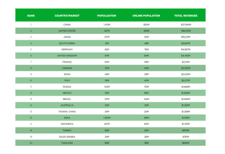 根据游戏工委发布的数据显示,中国自主研发游戏的海外收入从2018Q3至2019Q3是不断增长的,到2019Q3已经达到31.4亿美元,其市场排名前三的是美国占比32.2%、日本19.1%以及韩国11.5%。